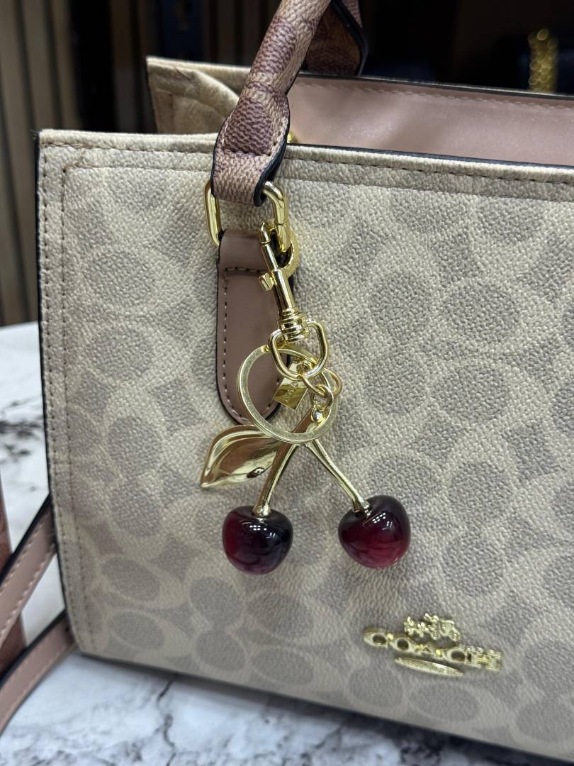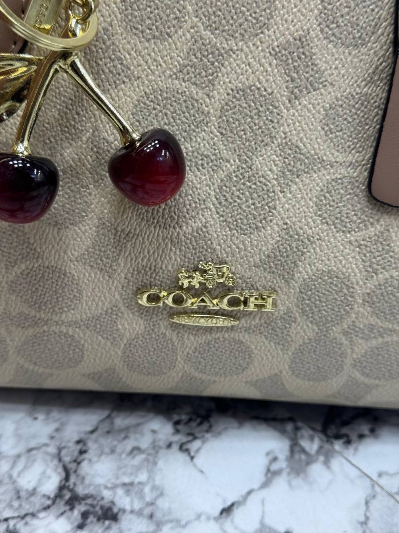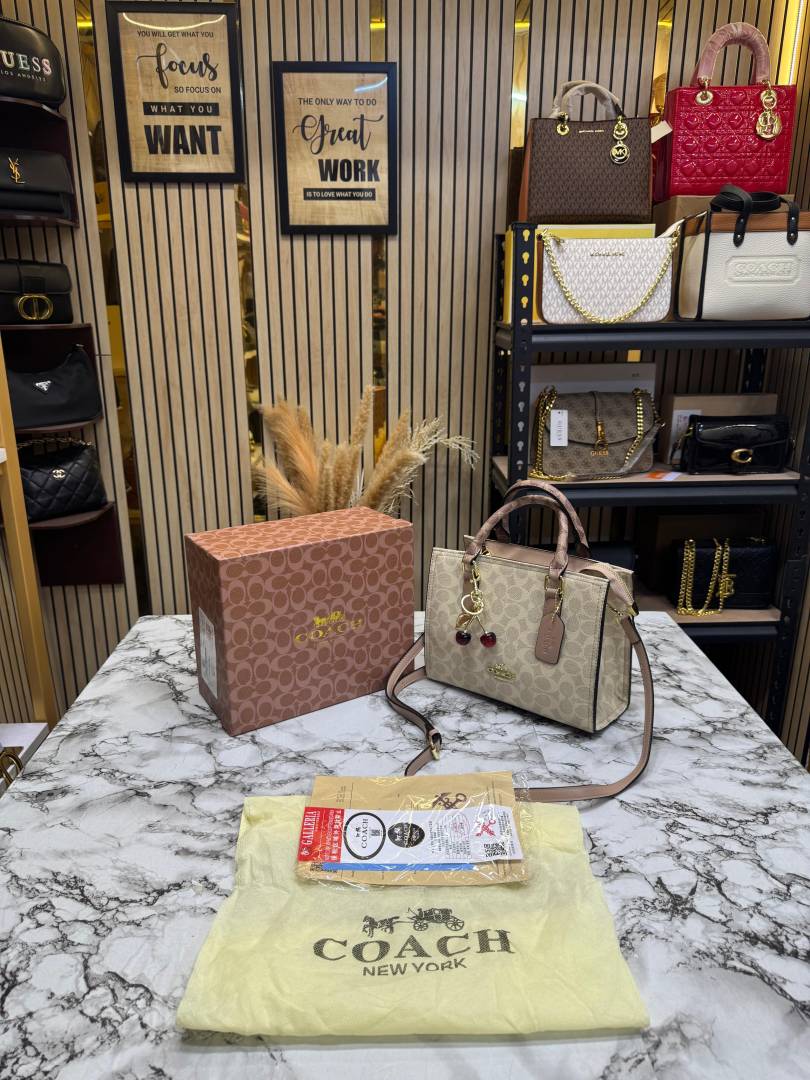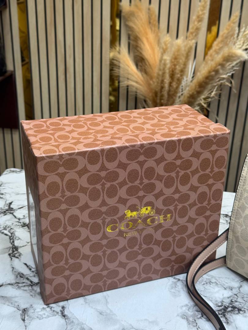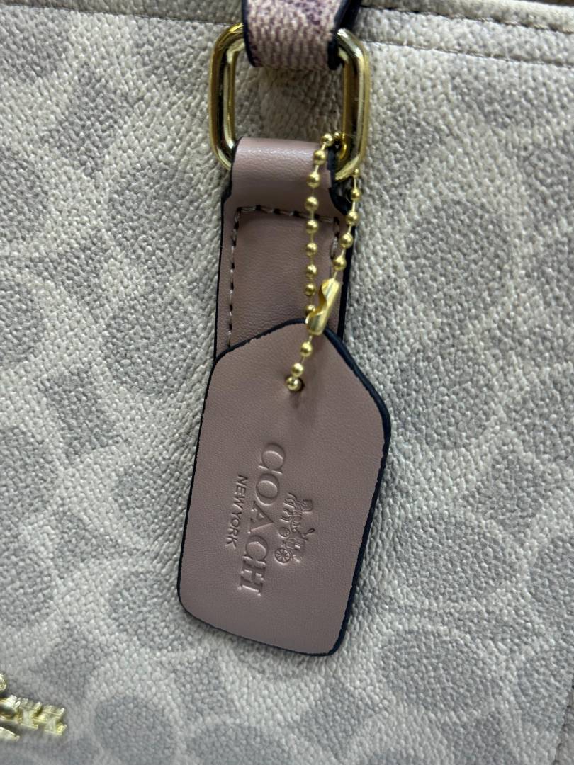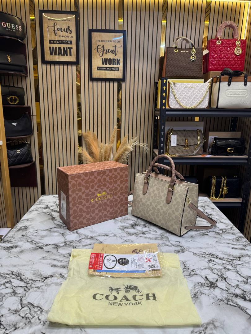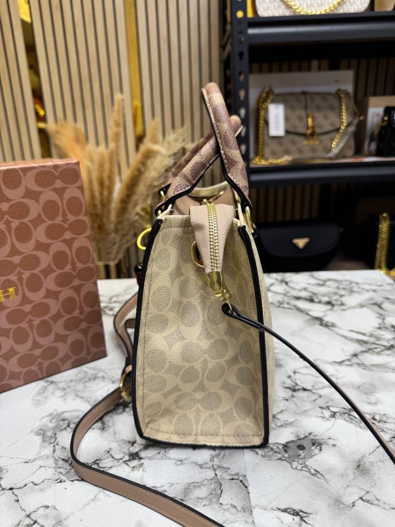 • Coac_h Maggie Medium Leather Tote Bag In Blocked Signature Canvas With Box And Dust Bag (Apricot-7933)