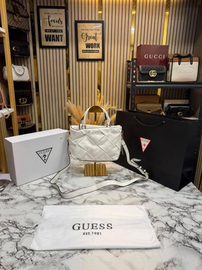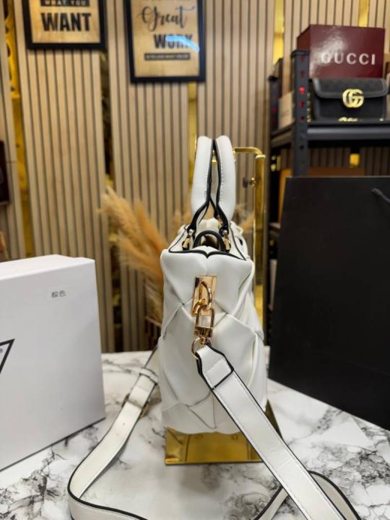 Guess Zaina Textured Structured HandBag With Box And Dust Bag Including Carry Bag (White)