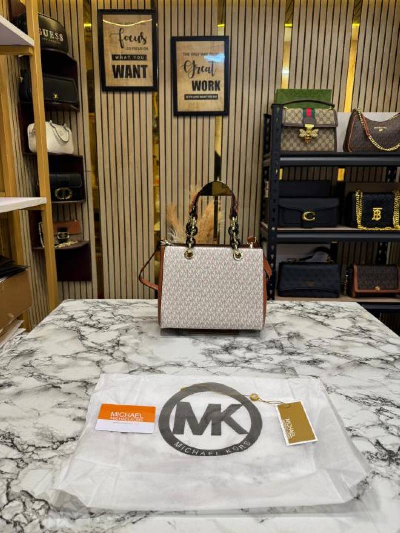 Michael_Kors Cynthia Signature Logo Satchel Bag With Dust Bag (Beige)